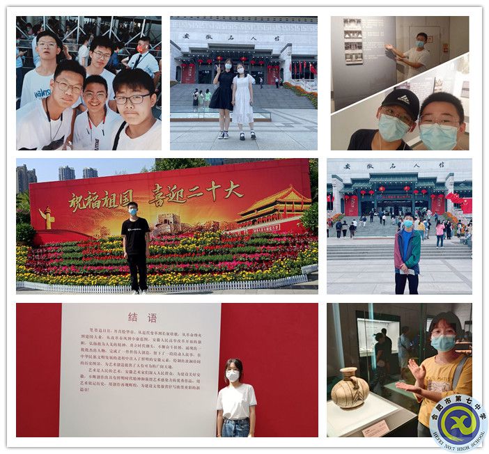 为欢庆祖国生日的到来,迎接党的二十大胜利召开,用行动向盛世中华献礼,合肥七中团委和各年级部在国庆节前夕组织各班在假期开展“强国新青年 奋进新时代”主题打卡活动。泱泱华夏,一撇一捺,都是脊梁。神州大地,一思一念,皆是未来。浩浩九州,一文一墨,均是骄阳。国庆节期间,高一年级的同学们走进各大展馆,踏着历史长河,穿越时光古道,感受国美,国盛,国强,国威。